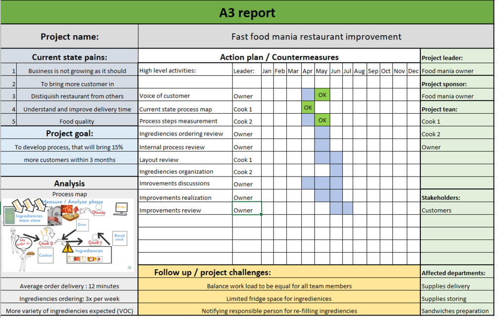 A3 report is one page report about project progress, its background, and challenges. It is easily explanation tool for broader audience, and stakeholders interested in the project.